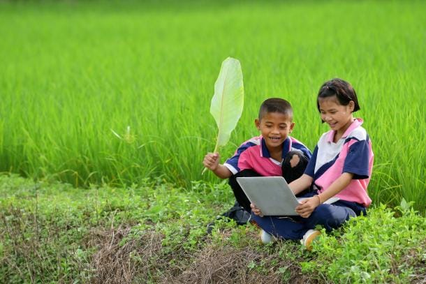 Children in rural Thailand use a tablet in the rice fields, symbolizing the goals of the UNESCO-backed workshop in Bangkok to expand AI and digital learning access nationwide Photo Courtesy Sirisak_baokaew